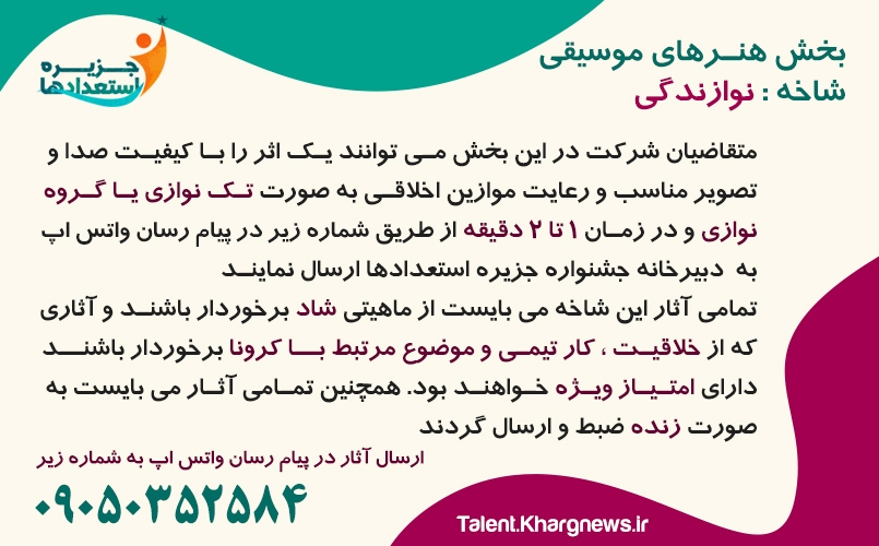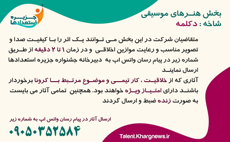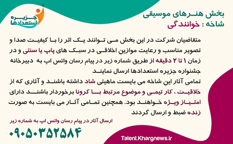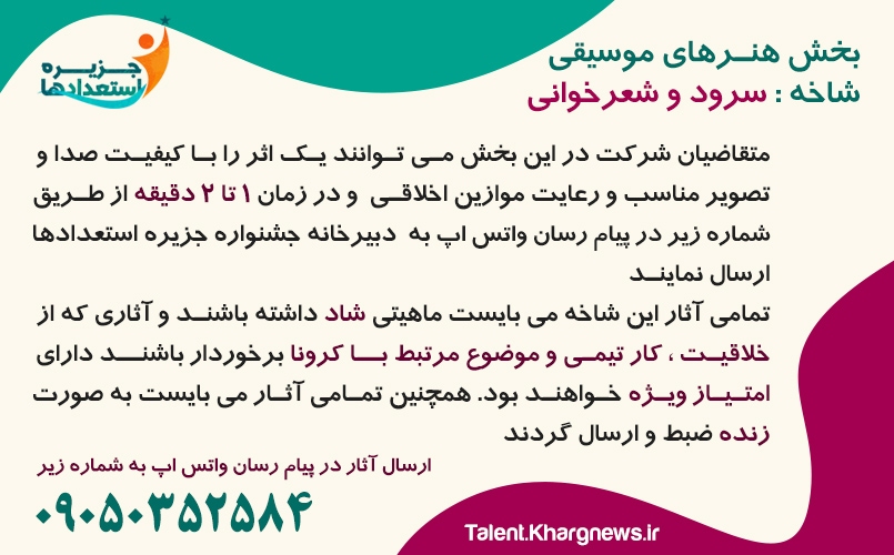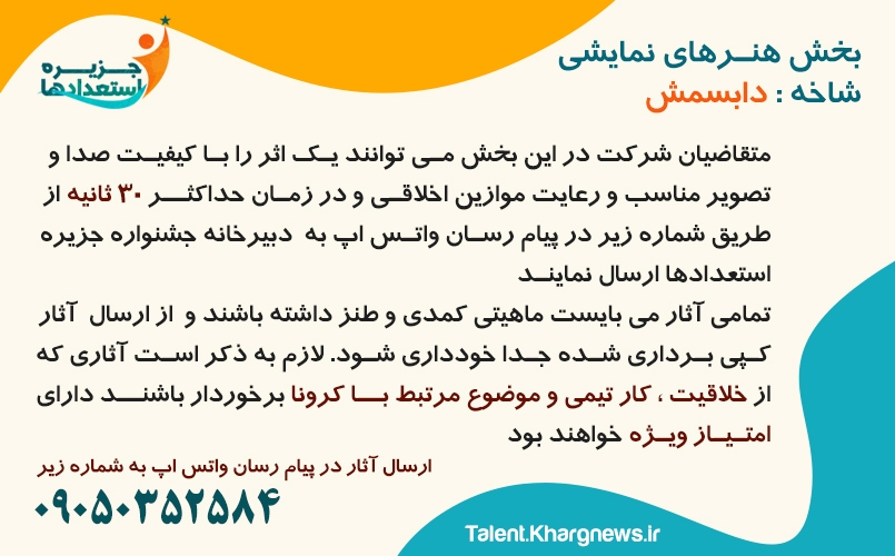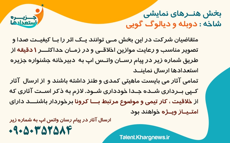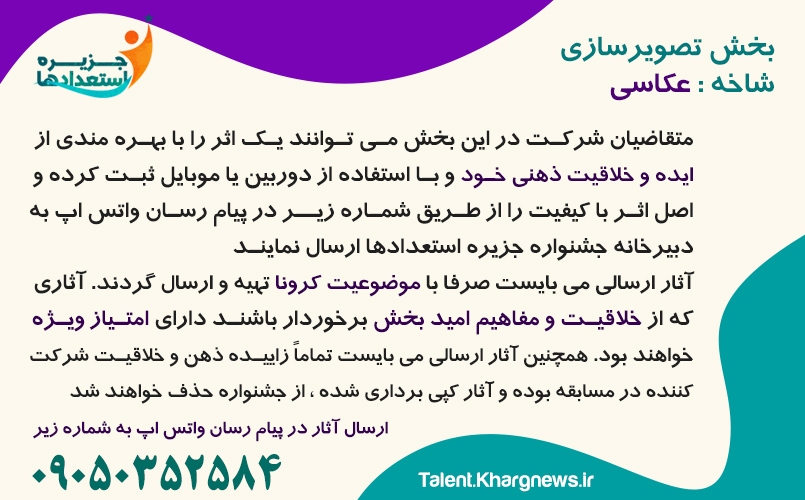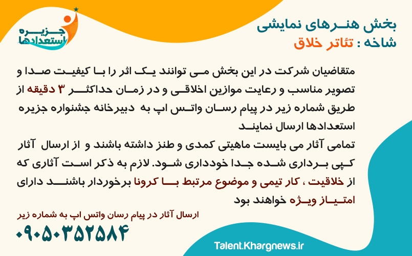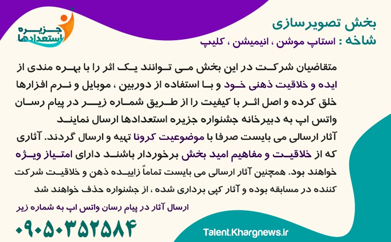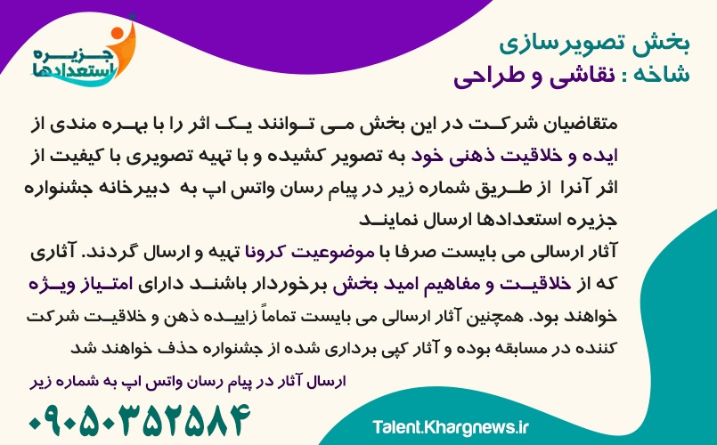 اگر فکر می کنید در هر یک از بخش ها و شاخه ها استعدادی دارید کافی است روی خودتان حساب کنید و بر اساس قوانین جشنواره آثار خودتان را ارسال نمائید